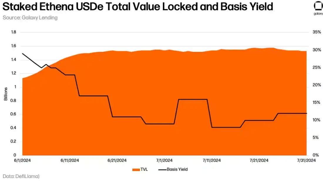 几个月前,Ethena 的收益曾达到约 30%,但现在已经降到了低十几个百分点。这一变化发生在一个备受期待的空投之后,该空投鼓励用户用协议代币来交换收益。此外,这一降幅也符合市场资金费率普遍下降的趋势。Ethena 最初是在 3 月资金费率大幅上升的时期推出的,那时市场表现强劲。随着市场结构的变化,由于 Ethena 的模型高度依赖于正资金费率,其收益也显著下降。