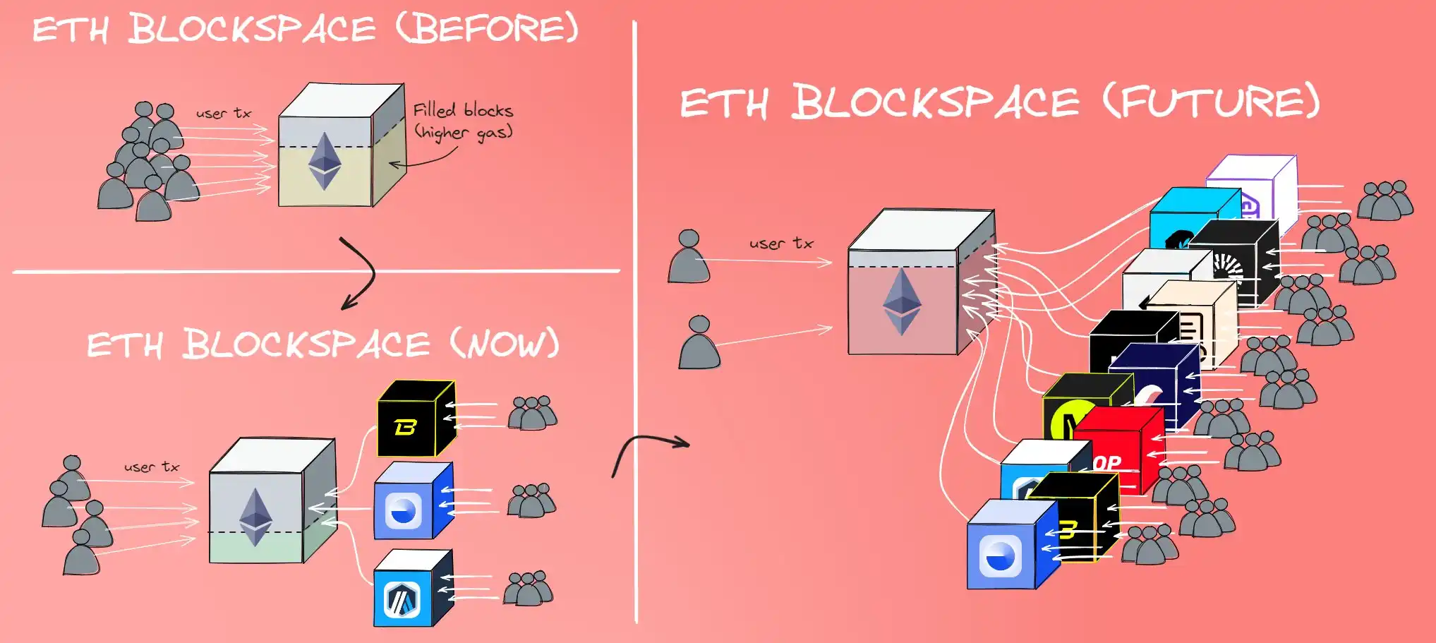 然后,这些用户会被大量新上线的 L2 网络所取代,这些新 L2 网络会争夺我们曾经用来铸造猴子权证的相同区块空间。