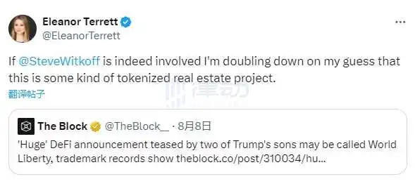 BlockBeats 消息,8 月 11 日,据福克斯商业记者 Eleanor Terrett 在 X 平台发文称,如果房产投资人、Witkoff Group 创始人 Steve Witkoff 参与了小特朗普的加密项目,那么这个项目很可能是一个代币化的房地产项目。