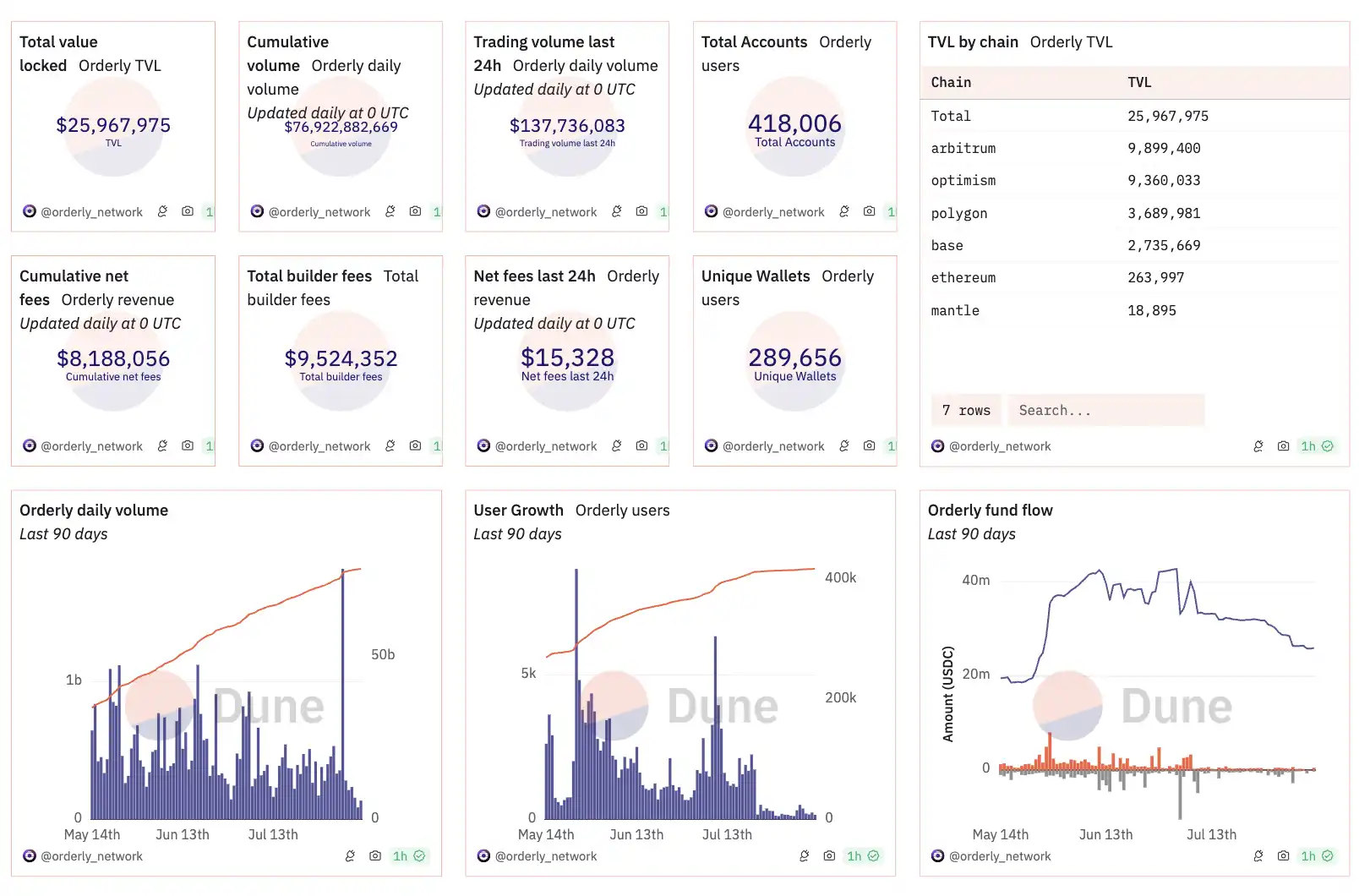 截止目前的数据统计,Orderly Chain 的交易量已达 769 亿美元,并在单日内创下了 18 亿美元的新高纪录。目前,独立钱包数量已增至 289,656 个,而总账户数为 418,006 个。