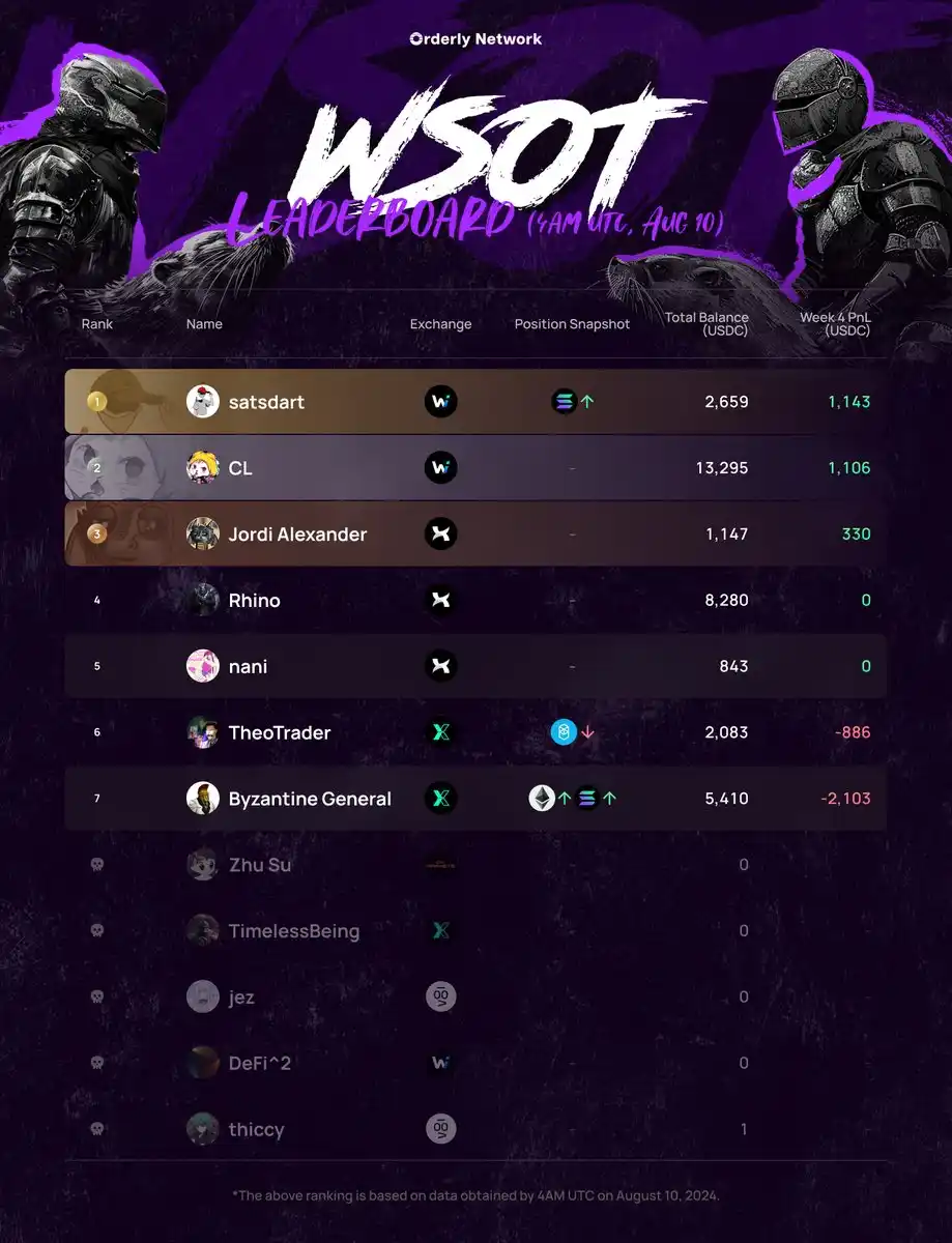 根据官方于 8 月 10 日发布的结果,satsdart 以 1143USDC 的盈利排名第一,CL 以 1106USDC 的盈利排名第二,Jordi Alexander 则以 330USDC 的盈利排名第三。