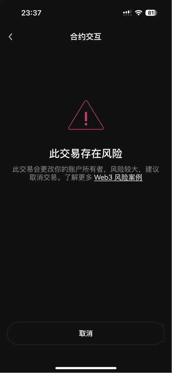 OKX Web3 钱包通过对待签交易进行前置解析,若解析发现交易内存在更改账户权限行为,则会为用户直接拦截交易,从根源阻止用户进一步签名,造成资损。