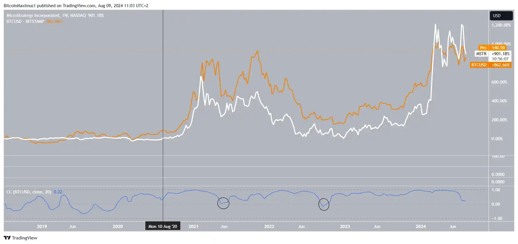 因此,MicroStrategy 的大规模购买、比特币价格和 MSTR 价格之间存在正相关性。MSTR 和比特币之间的相关性也呈现正相关,并随着每次购买而加强。