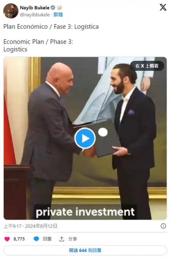 在此背景下,萨尔瓦多政府在 11 日表示,土耳其公司 Yilport Holding 将向萨尔瓦多的两个海港投资 16.2 亿美元,这也是萨国历史上最大的私人投资金额。总统布格磊也在周一分享的影片中表示: