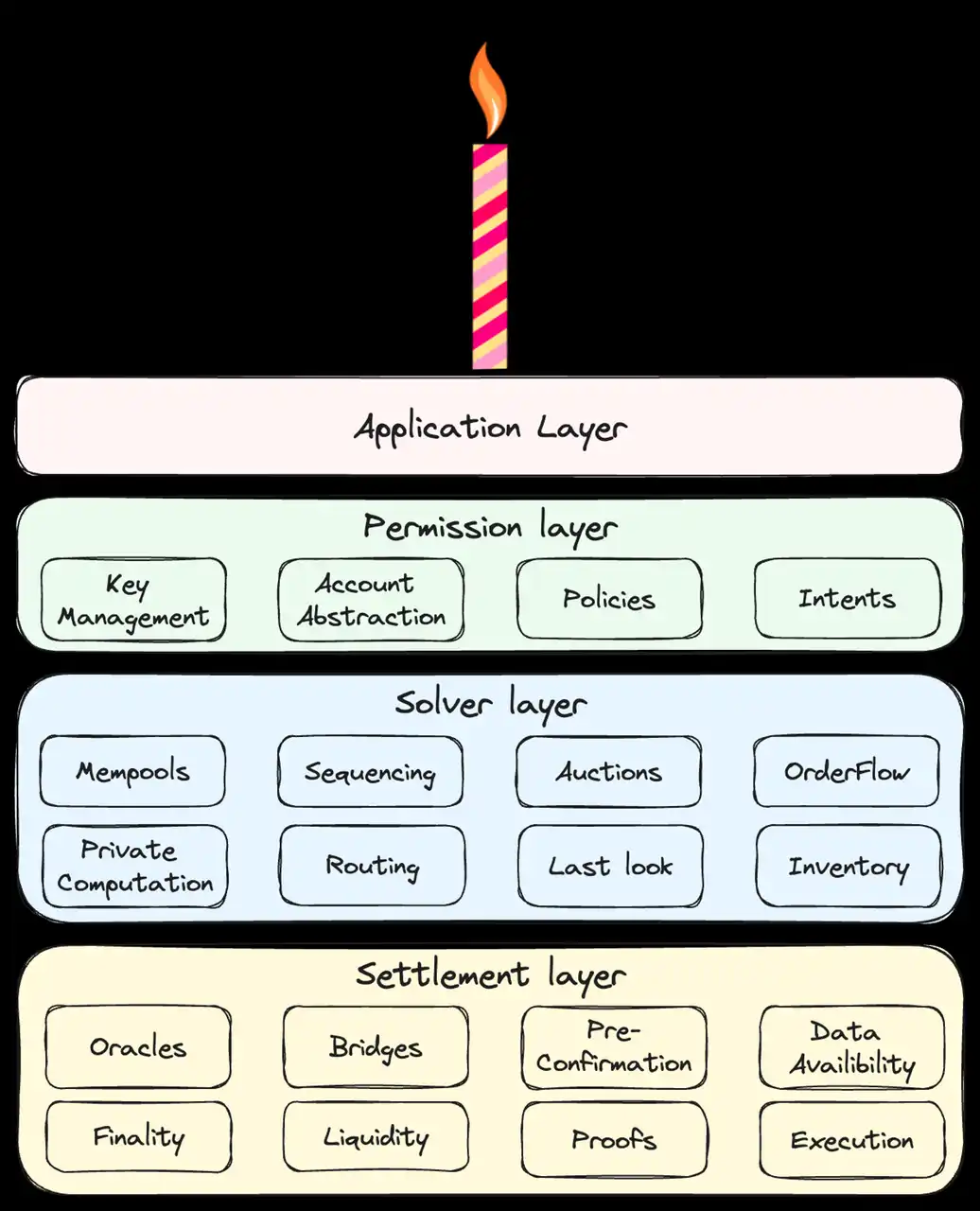 市场上关于链抽象的架构分类众多,比较知名的有 Frontier Research 开发的 CAKE 框架 (Chain Abstraction Key Elements)。这个框架结合了意图架构,将构成链抽象的各种技术和解决方案划分为权限层、求解层和结算层。也有其他框架在此基础上做出微调,如 Everclear 在求解层和结算层之间加入了一层清算功能。