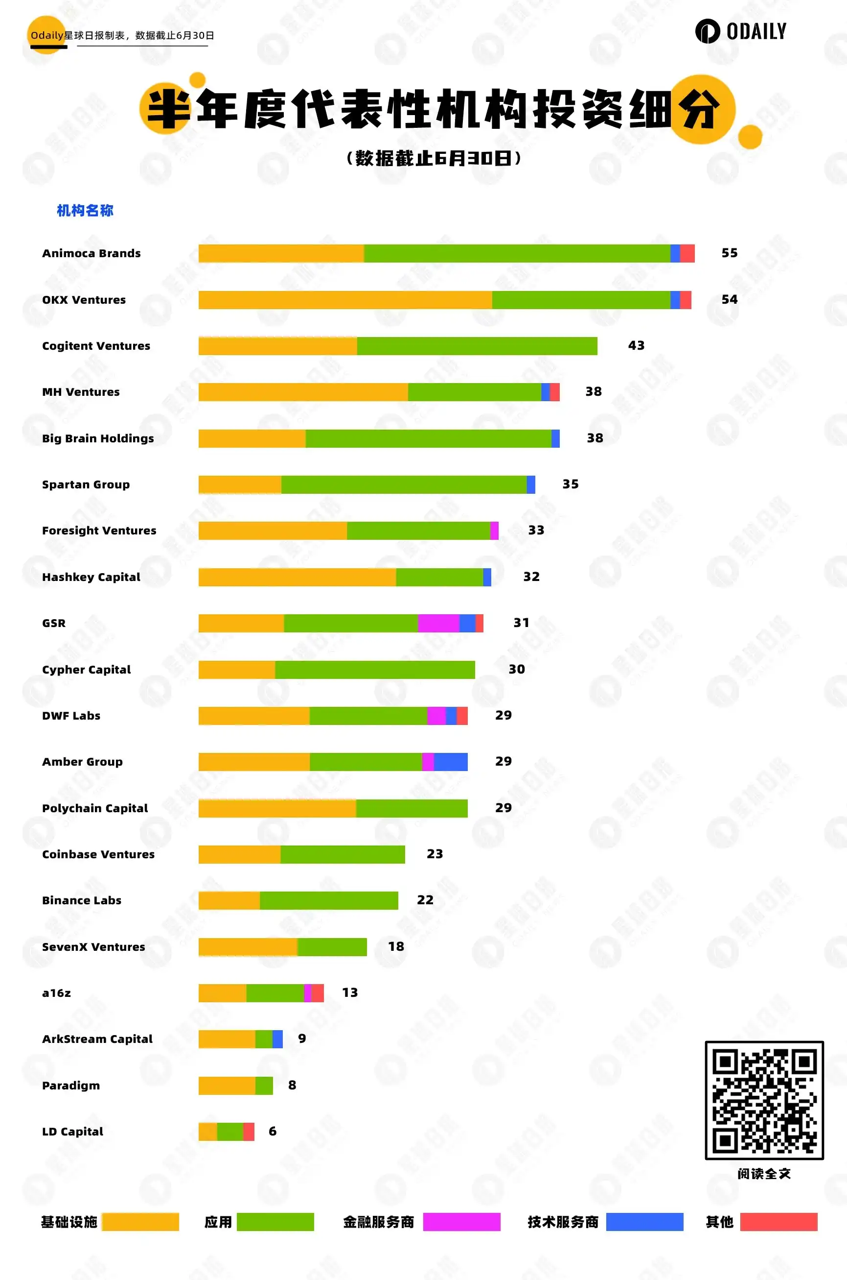 2024 年上半年,代表性投资机构包括 Animoca Brands、OKX Ventures、Cogitent Ventures、MH Ventures、Big Brain Holdings、Spartan Group、Foresight Ventures、Hashkey Capital、GSR、Cypher Capital 等组织,游戏、社交以及基础设施建设成机构热门投资标的。