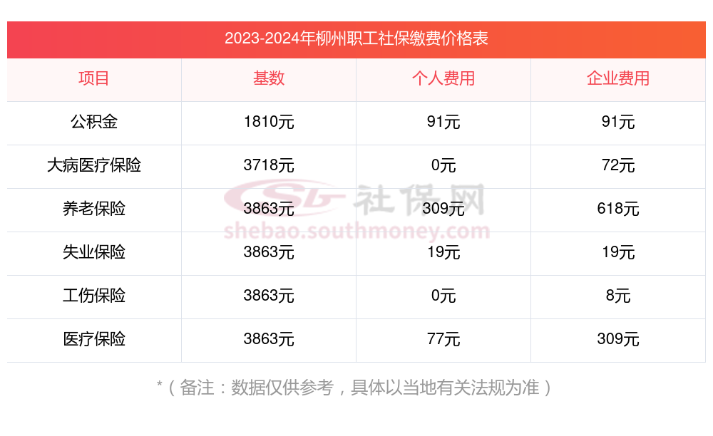 柳州2024社保缴费价目表,柳州社保养老保险、医疗保险缴费基数最新一览