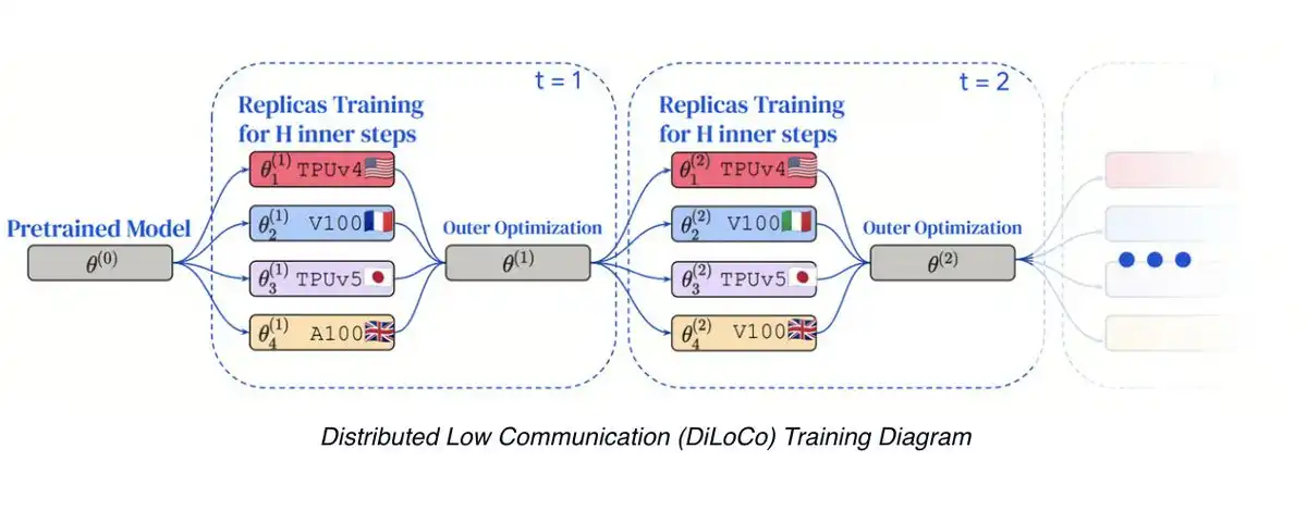 · 分布式低通信训练(DiLoCo):一种在连接不良的设备上进行数据并行训练的方法,每 500 步同步一次梯度,而非每步同步。