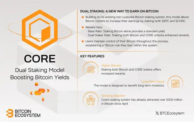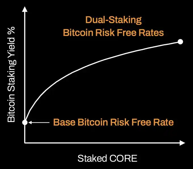 比特币持有者可以将他们的比特币质押在 Core 上,换取 CORE 奖励。Core 从中获得安全性,而比特币持有者则获得了此前无法获得的收益。现在,他们有机会通过双重质押获得更高的回报。双重质押使比特币质押者能够同时质押比特币和 CORE 代币,以获得更高的比特币质押收益率。质押者可以选择单独质押比特币以获得基础收益率,或者同时质押比特币和 CORE 以获取更高的回报。