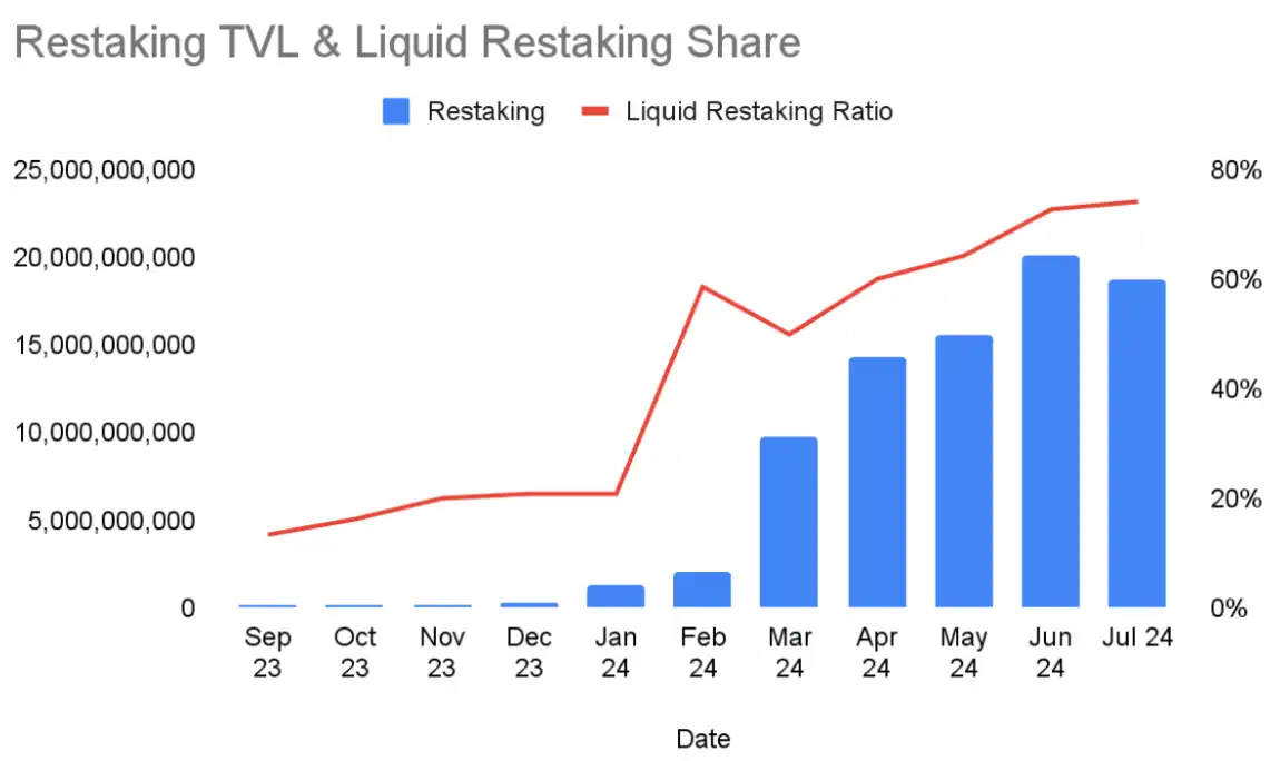 自 2023 年底以来,再质押存款激增。流动性再质押比率(流动性再质押中的 TVL/再质押中的 TVL)已达到 70% 以上,近几个月来持续增长约 5-10%,这表明再质押的大部分流动性都是通过流动性再质押协议进行的。随着再质押类别的扩大,流动性再质押协议预计也会随之扩大。