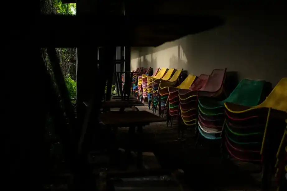 各种颜色的椅子堆放在 W 酒店阴凉的大厅里