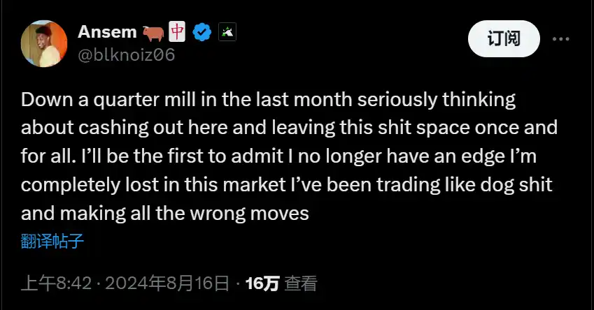BlockBeats 消息,8 月 16 日,加密 KOL Ansem 在社交媒体上表示,他在上个月内亏损了约 25 万美元,是其四分之一的资产,正在认真考虑套现并永久离开加密货币市场。Ansem 坦言自己在当前市场中完全失去了优势,感到迷失方向,近期交易水平极差(Trading like dog shit),做出了一系列错误的决策。