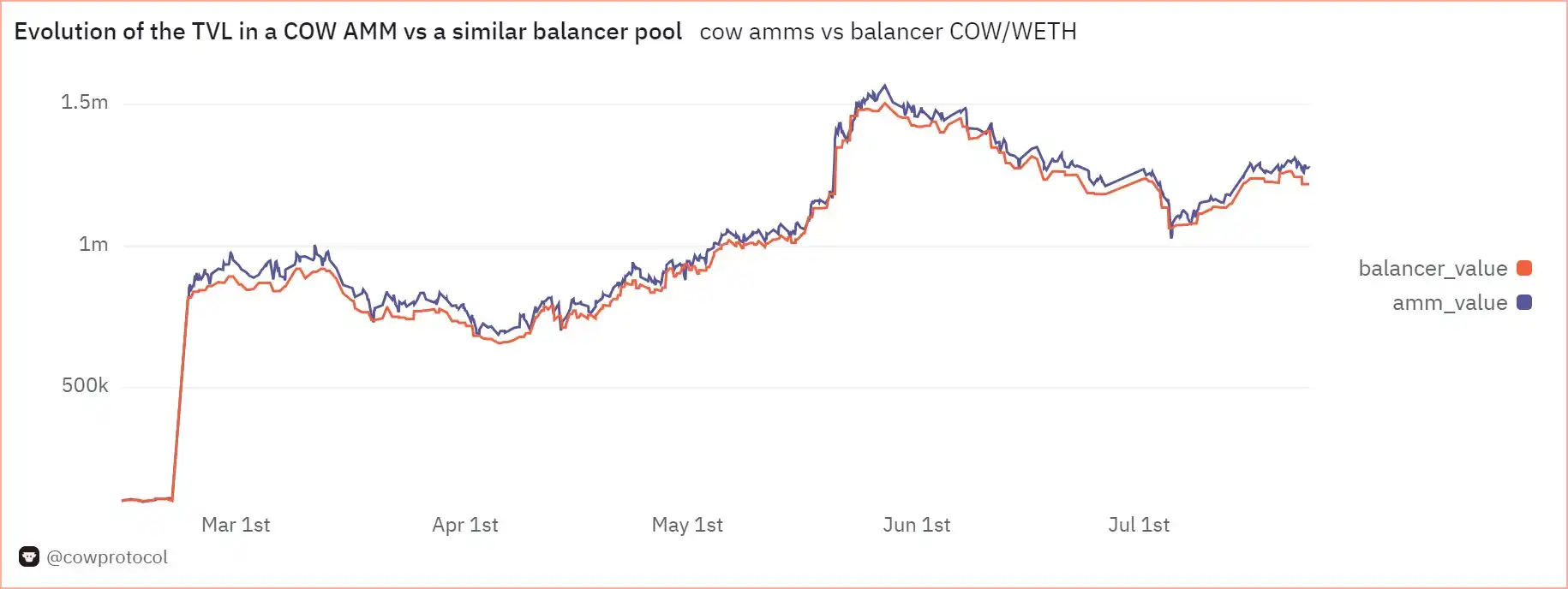 这种基于 Solver 干预的批量拍卖交易机制,使得 CoW Swap 专门防止外部交易者的价值被提取。在此机制基础上,CoW Swap 进一步推出了 CoW AMM,旨在不仅保护交易者的交易免受 MEV 的影响,还保护流动性提供者(LP)。CoW AMM 被提出作为一种捕获 MEV 的 AMM,旨在消除由于套利者导致的 LVR(再平衡损失)。
