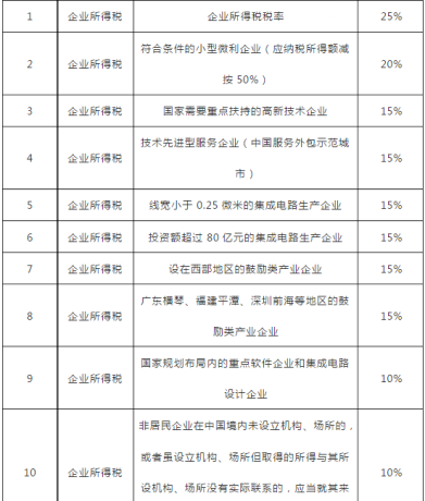 原“企业所得税暂行条例”规定,企业所得税税率是33%,另有两档优惠税率,全年应纳税所得额3-10万元的,税率为27%,应纳税所得额3万元以下的,税率为18%;特区和高新技术开发区的高新技术企业的税率为15%。外资企业所得税税率为30%,另有3%的地方所得税。新所得税法规定法定税率为25%,内资企业和外资企业一致,国家需要重点扶持的高新技术企业为15%,小型微利企业为20%,非居民企业为20%。