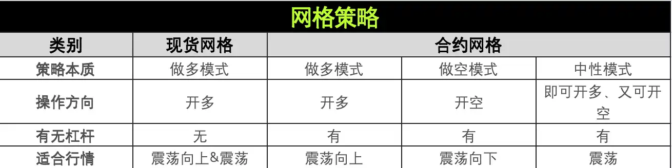 一般而言,网格策略分为:现货网格和合约网格 2 种。其中,合约网格又分为做多模式、做空模式、以及中性模式 3 种,每一种都有各自适合的行情。(注意:合约网格中性模式以下都简称为「中性合约网格」)