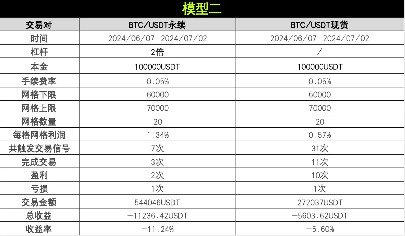 该模型为:横盘震荡 1h 运行周期下的中性合约网格与现货网格