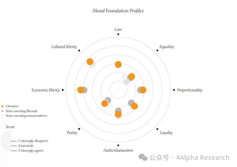 值得注意的是,比特币持有者呈现出一个独特的特征,即更加关注文化自由和平等;在圣洁和忠诚上与保守派相当,在关爱上与自由派相当,而在经济自由和权威主义上则处于自由派和保守派之间。