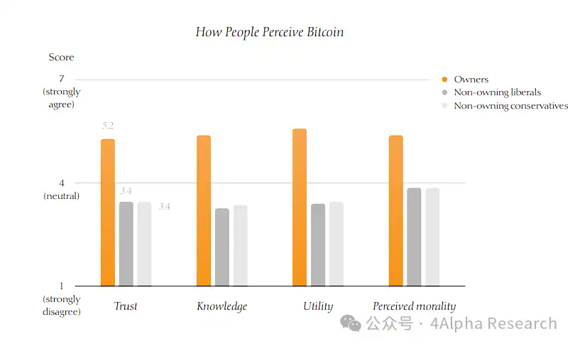 受访者被要求对这些认知相关的陈述表示同意或不同意。例如,针对信任的陈述是「我相信区块链是 100% 准确的。」调查结果显示,比特币持有者和非持有者在这些方面存在明显差异。比特币持有者普遍对其技术更有信心,并认为比特币在道德上是积极的。而非持有者则表现出不信任或中立的态度。