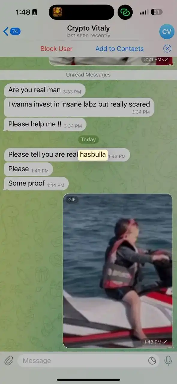 尽管如此,一些用户在聊天中质疑他是不是真的。Insane Labz Telegram 群组的管理者对此含糊其辞。「也许他是真的,」Insane Labz 在 Telegram 群组中回复道。