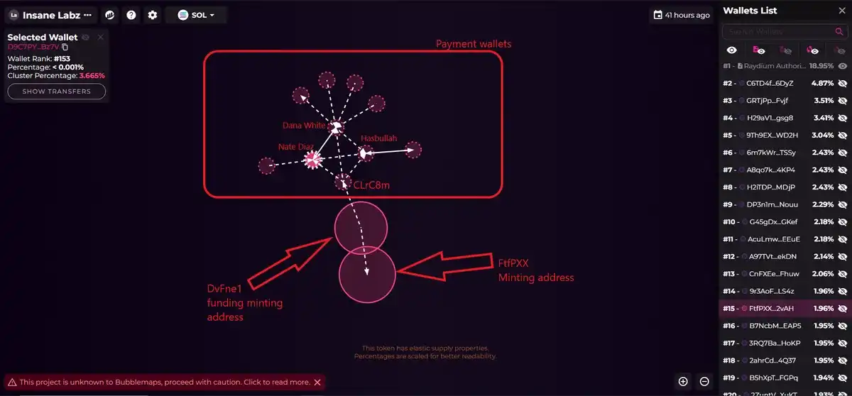 Decrypt 和区块链分析公司 Bubblemaps 审查的区块链数据显示,与 Insane Labz 团队相关的加密钱包向这群喷子支付了一小笔费用,每人 155 美元的 Solana。