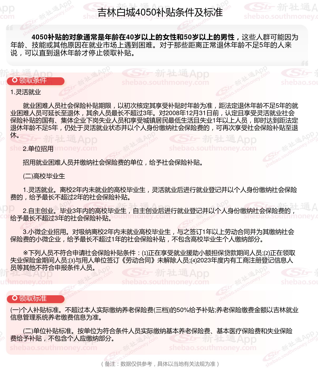 2024吉林白城灵活就业4050社保补贴是一项面向特定年龄段的就业困难人群的社会保险补贴。