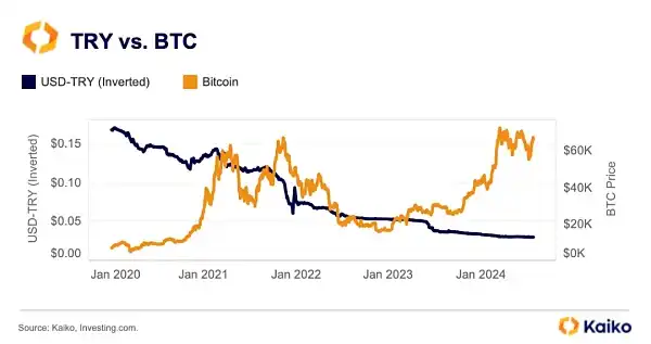 3、加密货币的避险作用:与里拉的贬值相反,比特币自 2021 年以来的价格显著上涨,成为了土耳其投资者的一个重要保值工具。这导致 BTC-TRY 交易对的交易量激增,自 2021 年以来上涨了 800% 以上。