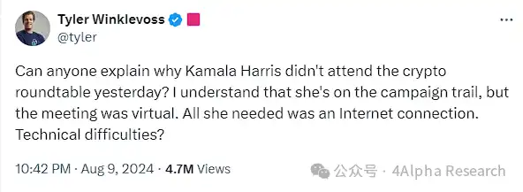 当然,考虑到哈里斯刚刚被提名为总统候选人,事务繁忙,未能参加大会或许可以理解。但随后,在加州民主党众议员 Ro Khanna 组织的虚拟圆桌会议中,哈里斯的再次缺席引起了加密行业的广泛质疑。会议上,包括 Ripple 高管 Brad Garlinghouse 和 Chris Larsen、Uniswap 首席执行官 Hayden Adams 等知名加密行业代表与民主党官员进行了对话。哈里斯作为民主党的代表,理应出席该会议。因此,Gemini 联合创始人 Tyler Winklevoss 在 X 平台上公开质疑哈里斯未参加会议的原因,以表达自己的不满。