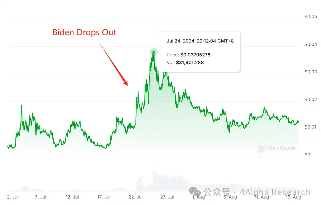 与此同时,哈里斯概念 Meme 币 Kamala Horris($KAMA)的价格也在不断上涨。根据 Coingecko 数据,截止本文撰写时,$KAMA 价格已达到 0.0131 美元,较 8 月 4 日的低点 0.0089 美元上涨近 47%。此前,随着拜登退选,$KAMA 曾一路飙升至 0.038 美元。相比之下,特朗普概念币 MAGA($TRUMP)较一个月前的高点已经下跌了 60% 以上。