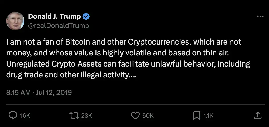 如果说 2024 年加密货币领域最受关注的议题,贯穿到底的是美国大选这一议题,相关 meme 币横飞、不落下政治大人物的每一场会议,一己之力再次带火预测市场。处于这场漩涡中心的是美国前总统特朗普,其从加密冷感政客成为了如今振臂一呼支持比特币的新一届总统候选人。加密,成为今年特朗普竞选的一个新突破点。