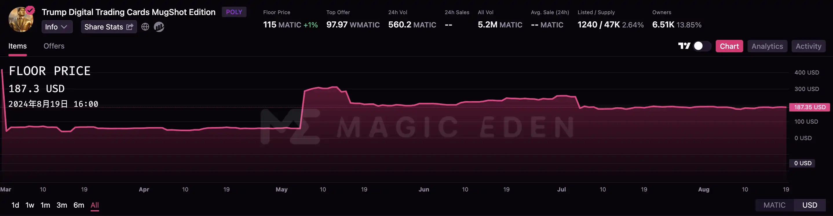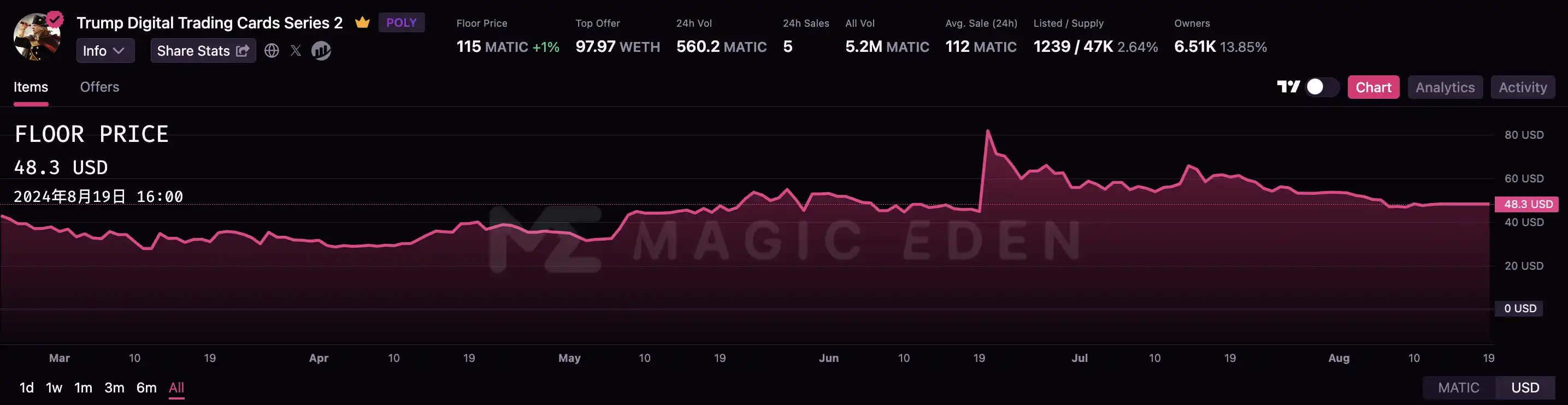 2023 年,特朗普连发两个新系列 NFT「Trump Digital Trading Cards Series 2」以及「Mugshot Edition」,并推出 NFT 权益,如特朗普晚宴、签名纪念品等。