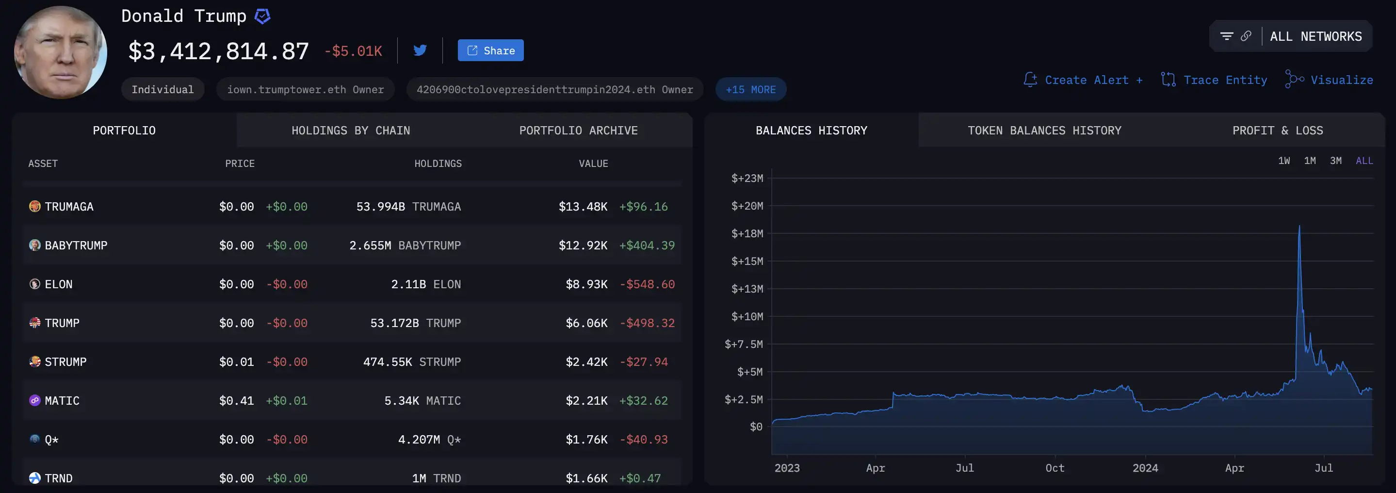 据 Arkham 数据监测,目前特朗普公开地址持有超过 340 万美元的加密资产,较今年以来高点跌超 80%。