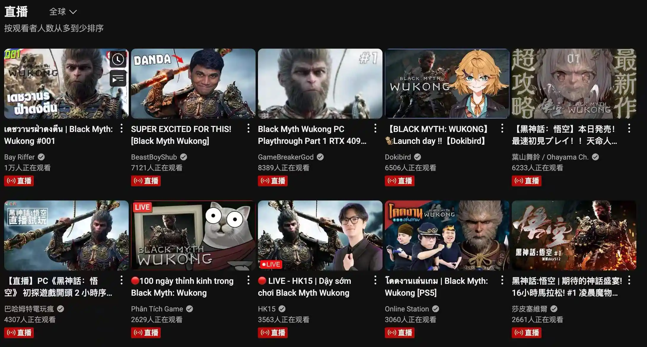 2024 年 8 月 20 日,百万玩家翘首以盼的国产 3A 大作《黑神话·悟空》终于正式上线,游戏在线人数一度突破 140 万人,位列 Steam 历史最高在线人数第四位。不仅是在中国区,目前 Steam 全球热销商品中,《黑神话·悟空》也持续霸榜第一名,另外在今天的 Youtube 直播首页,也几乎清一色是黑神话的游戏直播。