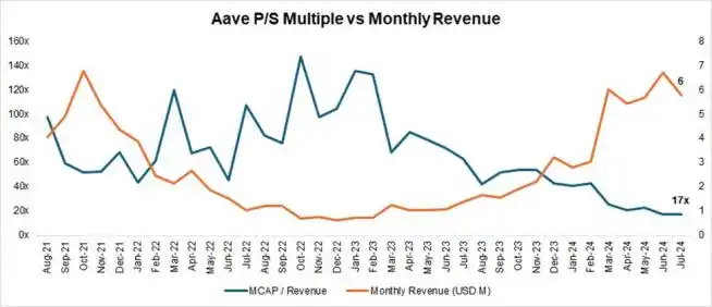 尽管过去几个月指标强劲复苏,但 Aave 市销率仅 17 倍,处于 3 年来最低水平,远低于同期 62 倍的中位数水平。