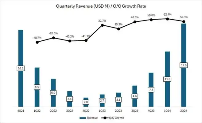 Aave 也是少数指标超越 2021 年牛市水平的 DeFi 协议之一。例如,其季度收入已超过 2021 年第四季度的牛市高峰期。尤为引人注目的是,即使在 2022 年 11 月到 2023 年 10 月的市场盘整期,Aave 的收入仍加速增长。随着市场在 2024 年第一季度和第二季度回暖,Aave 势头不减,环比增速达到 50-60%。