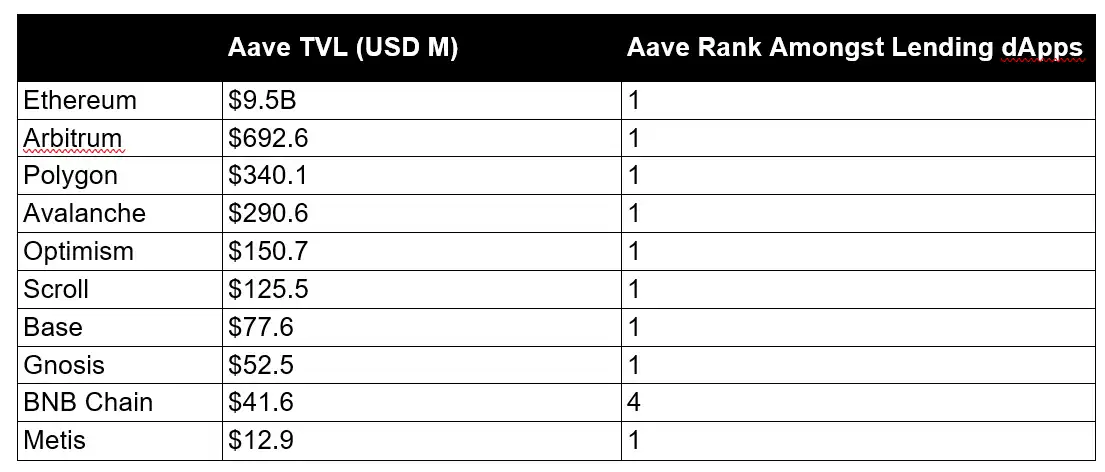 · 多链生态定位:Aave 已部署于几乎所有主流 EVM L1/L2,并且在除 BNB Chain 外的所有部署链上,TVL 均保持领先。即将推出的 Aave V4 版本将打通跨链流动性,进一步彰显其跨链流动性优势。详见下图: