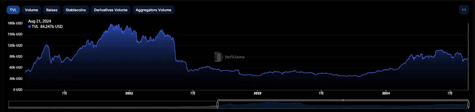 截至 2024 年 8 月 21 日,多链 DeFi 的总锁定价值(TVL)已降至 84.6 亿美元。这一数字较 2021 年 12 月创下的历史峰值 186.8 亿美元下降了 54.7%,仅比 Luna 事件引发的市场动荡后的水平高出 61%。这种显著的下降趋势,部分可以归因于资产整合的普遍减少,例如以太坊和比特币的封装资产等,同时,资本外流的压缩也对这一下降趋势有所贡献。