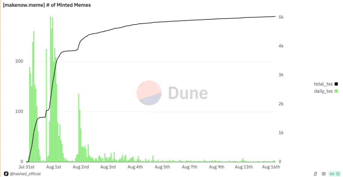 MakeNow.Meme 作为新的发行平台,虽然现在热度低迷,但刚推出时引发了极大热潮,一时间名人币纷纷爆发。其上一天发行了超 2600 个 Memecoin,收益超 230 SOL。MakeNow.Meme 的发行机制相较于 Pump.fun 来说,不仅是对资产发行方式的再简化,也为做市模型提供了新的方向。