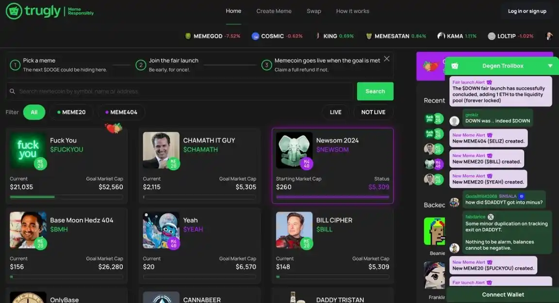 Trugly.meme 作为一个 Memecoin 发行平台,其资产发行机制相比 Pump.fun 没有太多不同,但其资产玩法更加多样。推出的 MemeX 允许任何人为 Twitter 帐户创建 memecoin,只有帐户所有者可以认领 MemeX memecoin。认领后会将 80% 的交易费转移给帐户所有者。其次,它采用了 MEME404 代币标准,允许 memecoin 持有者通过 NFT 显示余额,解锁不同的级别。MEME404 具有内置机制,可以根据 memecoin 余额的变化自动铸造和销毁 NFT,确保等级更新。