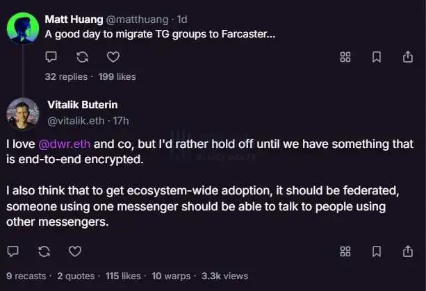 Vitalik:Farcaster整合Telegram群组时机并不成熟,需首先建立端到端加密通信体系