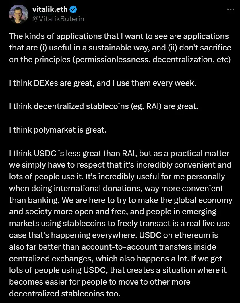 BlockBeats 消息,8 月 25 日,Vitalik Buterin 于 X 发文表示:「Aave 很好,我很感激它的存在。我认为 DEX 很棒,我每周都会使用它们。我认为去中心化稳定币(例如 RAI)很棒。我认为 Polymarket 很棒。」