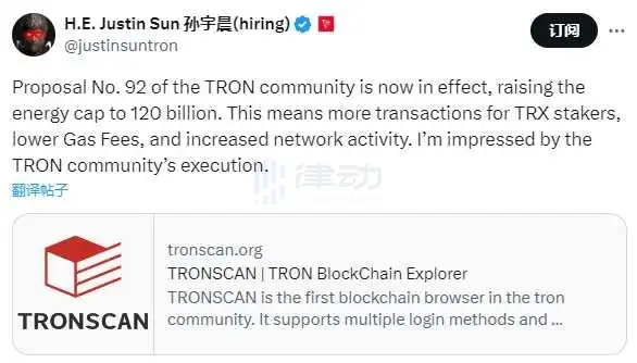 Justin Sun:TRON社区已通过提高能源上限提案,网络gas费用将显著降低