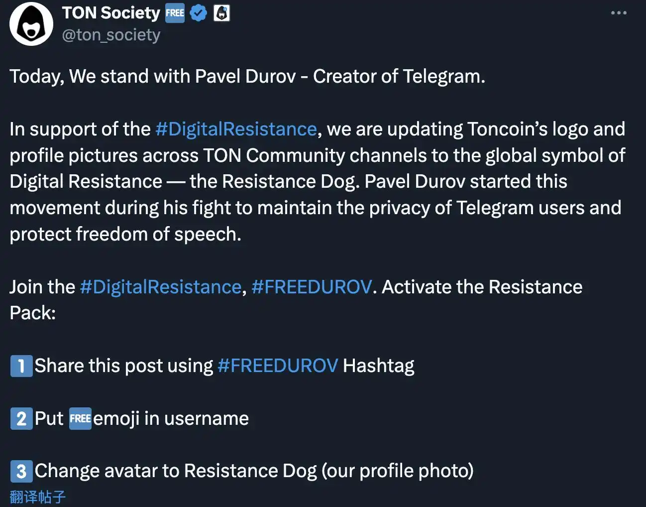「今天,我们与 Telegram 的创建者 Pavel Durov 站在一起。为了支持 DigitalResistance,我们将 TON 社区频道上的 Toncoin 徽标和个人资料图片更新为数字抵抗的全球象征——抵抗狗。Pavel Durov 在为维护 Telegram 用户隐私和保护言论自由而战时发起了这项运动。」