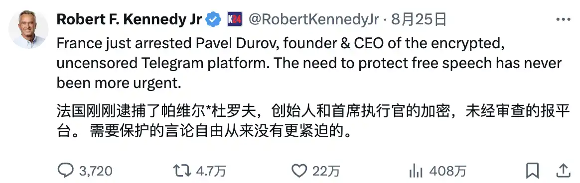 美国总统竞选人 Robert F. Kennedy Jr. 在社交媒体上表达了对 Durov 被捕事件的关注。他指出:「法国刚刚逮捕了 Telegram 的创始人兼 CEO Pavel Durov,这个平台以其加密和不受审查的特性著称。保护言论自由的需求从未如此紧迫。」