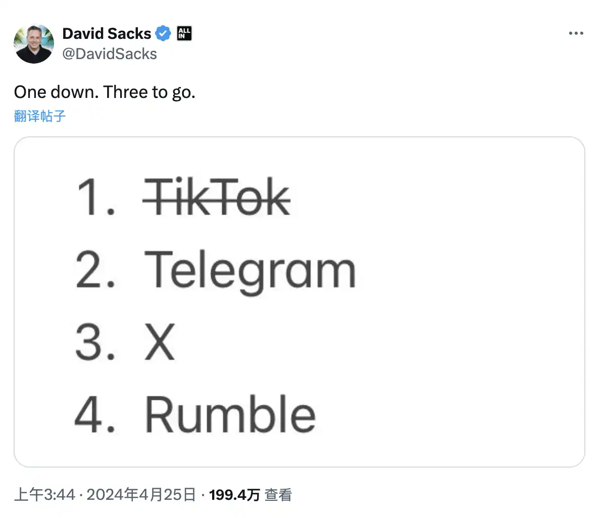 在社交媒体上,David 用了一张图表达了目前其他几大社交媒体的不同境遇,「One down. Three to go.」似乎意指西方对另外三个「赶尽杀绝」。