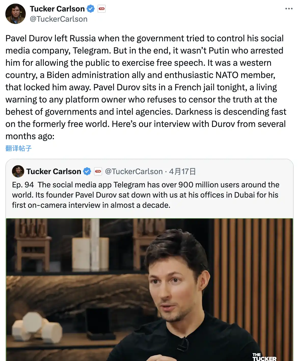 美国著名保守派政治新闻记者和评论员 Tucker Carlson 在 Twitter 推出自制节目《Tucker on X》后,曾采访过 Pavel Durov,因此他的言论也收到极大关注。他在 Twitter 的评论中提到: