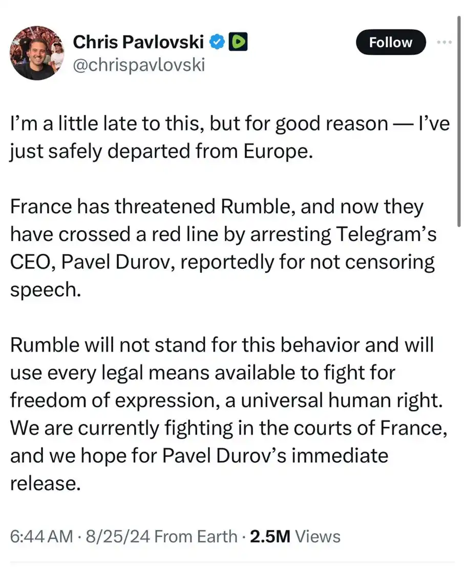 与 Durov 的事业联系在一起不只有马斯克,还有加拿大短视频分享平台 Rumble。在 Durov 被捕后,Rumble 的首席执行官 Chris Pavlovski 快马加鞭的离开欧洲,并对法国政府的行为表示强烈不满。
