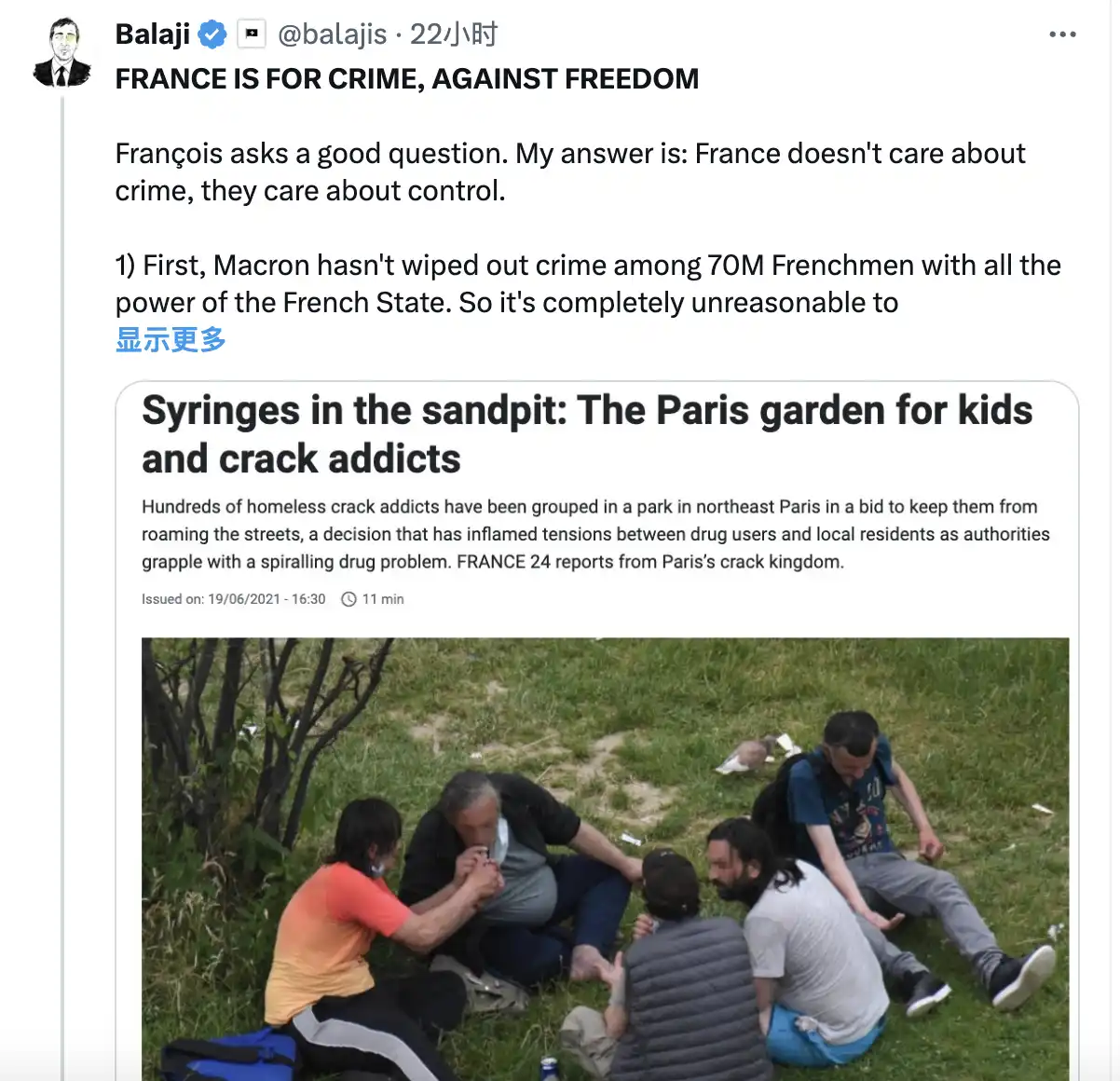 Balaji 指出:「法国不在乎犯罪,他们在乎的是控制。Macron 尚未能在 7000 万法国人中消除犯罪,却期待 Durov 用微薄的内容审核力量管理 10 亿 Telegram 用户,这完全不合理。」