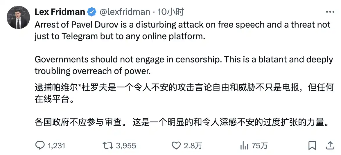 「逮捕 Pavel Durov 是对言论自由的令人不安的攻击,不仅威胁到了 Telegram,也威胁到了所有在线平台。政府不应该参与审查,这是对权力的公然滥用和深感不安的越界行为。」Fridman 的言论强调了他对政府过度干预和审查的反对,呼吁保护在线平台的自由与独立。