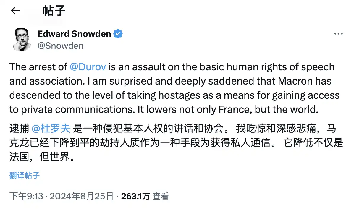 爱德华·斯诺登也是隐私加密货币 Zcash 的六位创始人之一,但他与 zooko 的意见完全不同。因为自身的经历和身为著名的隐私倡导者,斯诺登对 Durov 的被捕表示强烈不满,并在社交媒体上为其发声: