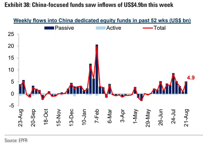 中国股市一直跌,但中国概念的基金一直在净流入,这周净流入 49 亿美元创下五周来新高,连续第 12 周净流入,对比其他新兴市场国家,中国也是流入最多的。敢于选择在当前市场下行中逆势加仓的,不是国家队就是长线资金吧,赌你只要股市不关停,最终会涨回来。